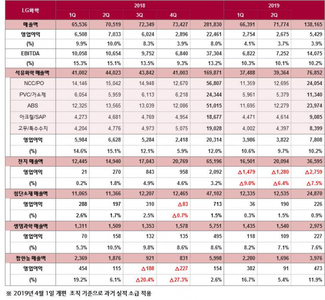 LG화학 COO(최고운영책임자) 정호영 사장은 “석유화학부문의 시황 악화와 대정비(T/A) 영향, 전지부문의 비경상 손실 등 일회성 비용의 영향으로 영업이익이 감소했다”며 “3분기에는 일회성 비용 부담이 대부분 해소되고 석유화학부문의 고부가 제품 증설 물량 가동 효과, 전지부문의 매출 증대 및 생산 안정화로 전반적인 실적 개선이 예상된다”고 설명했다.
