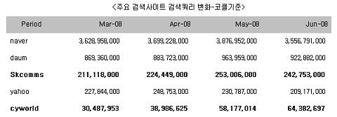 한편, 싸이월드는 통합검색의 성과에 힘입어 코리안클릭에서 집계한 지난 5, 6월 통합검색 쿼리 순위에서 싸이월드와 엠파스, 네이트닷컴을 포함하는 SK커뮤니케이션즈의 검색 쿼리가 2개월 연속 야후를 넘어 3위로 올라섰다.