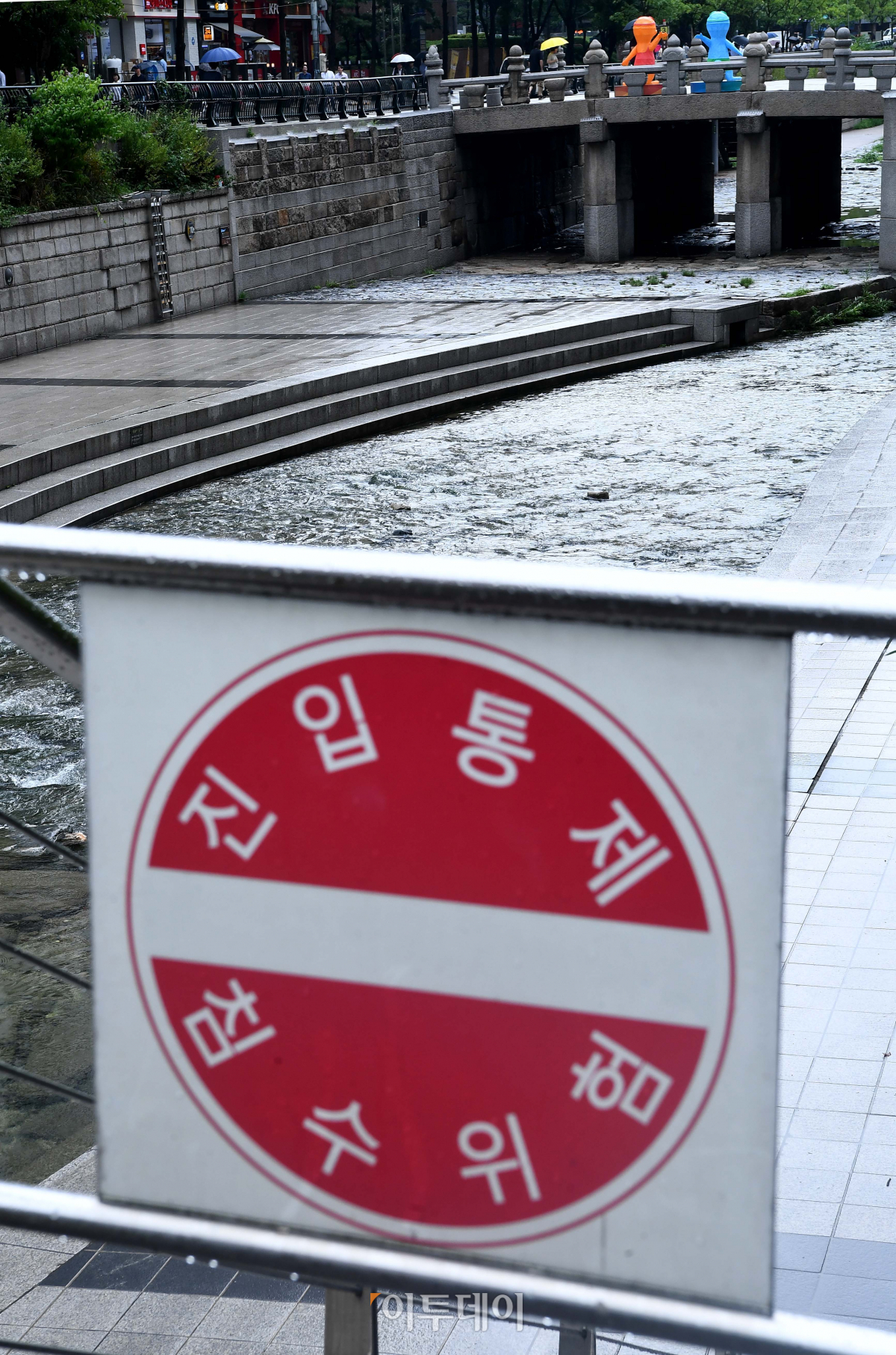 중부지방에 호우경보가 내려진 26일 서울 종로구 청계천 산책로의 출입이 통제되고 있다. 신태현 기자 holjjak@