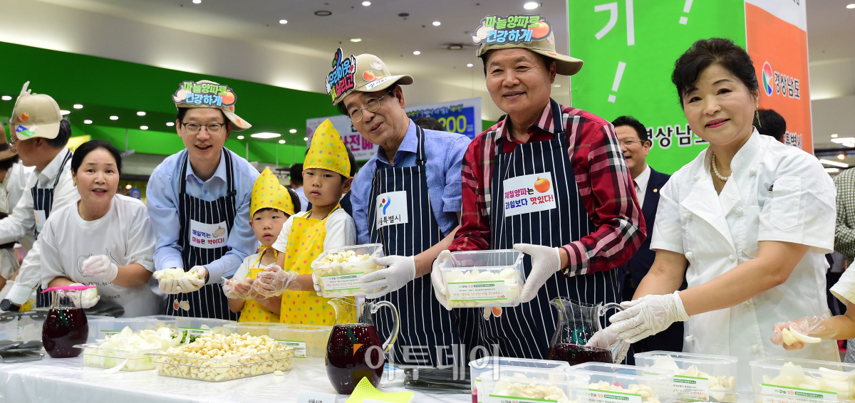 박원순 서울시장과 김경수 경남지사, 김병원 농협중앙회장이 26일 서울 서초구 농협하나로마트 양재점에서 열린 '경상남도 마늘‧양파 소비촉진을 위한 경남농산물 특판전 개장식'에서 장아찌를 담그고 있다. 작황 호조로 가격이 폭락한 경상남도 마늘‧양파의 소비촉진을 위해 마련된 이날 행사에서 만들어진 장아찌는 소외계층에 전달된다. 신태현 기자 holjjak@