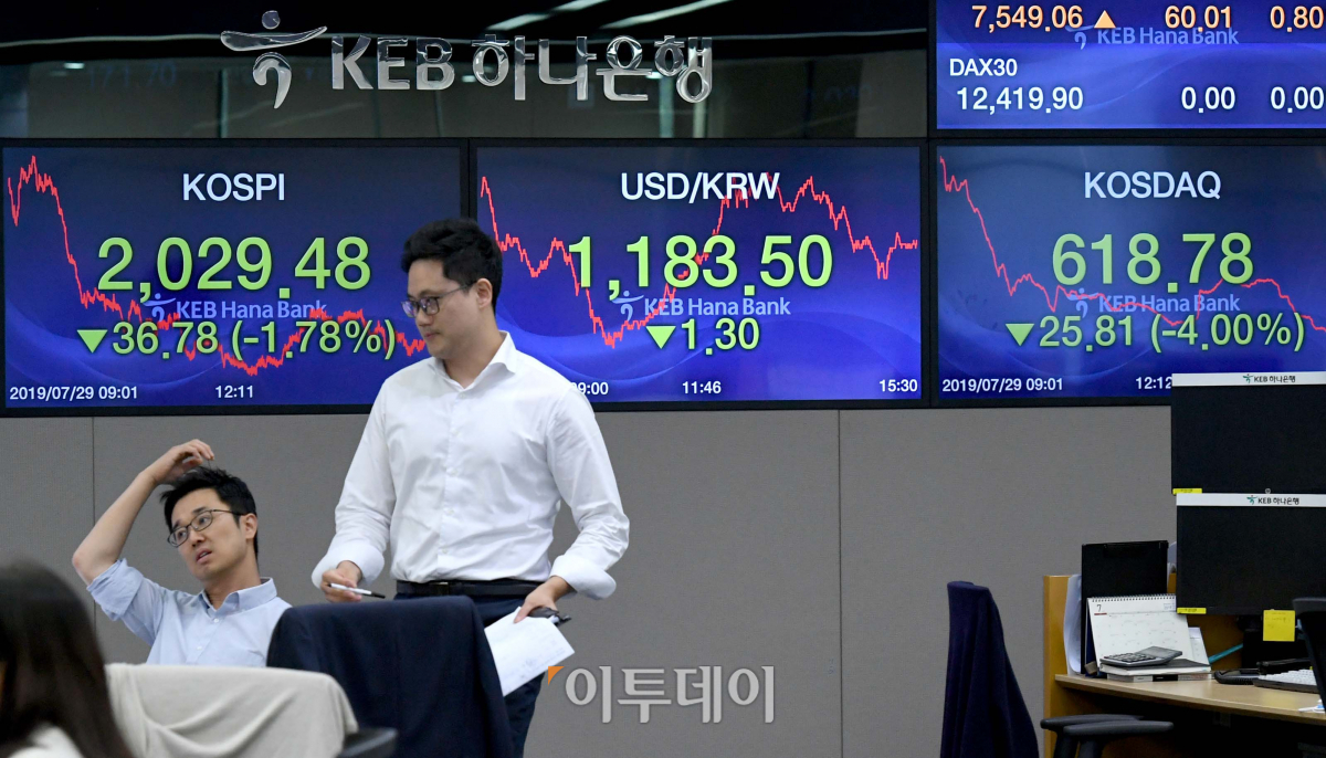 29일 오후 서울 중구 KEB하나은행 딜링룸 전광판에 코스피지수가 전 거래일보다 36.78포인트(1.78%) 내린 2029.48을 코스닥지수가 25.81포인트(4%) 급락, 2년 3개월 만에 최저치인 618.78을 가리키고 있다. 신태현 기자 holjjak@