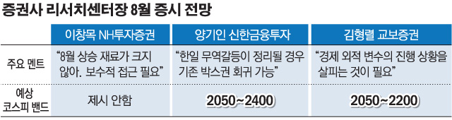 이창목 NH투자증권 리서치센터장도 “8월 증시는 완전한 조정 국면에 들어설 전망”이라며 “작년 4분기부터 이어진 수출 부진이 기업의 실적 악화로 이어지면서 국내 증시의 가장 큰 걸림돌로 작용하고 있다”고 강조했다. 다만 코스피 예상지수는 제시하지 않았다.