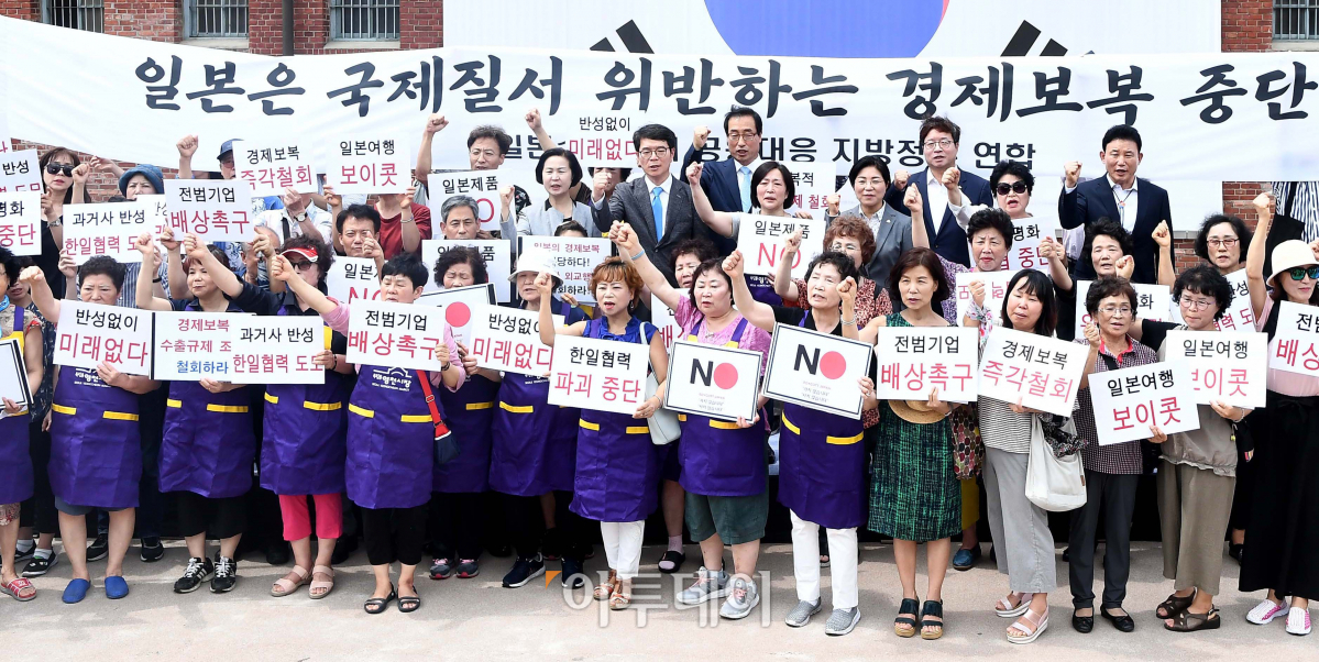 30일 서울 서대문구 통일로 서대문형무소 역사관에서 열린 ‘일본의 수출규제 조치 규탄대회’에서 지자체장들과 시민들이 일본 정부를 규탄하는 구호를 외치고 있다. 이날 규탄대회엔 전국 52곳 지방자치단체로 구성된 ‘일본 수출규제 공동대응 지방정부 연합’의 정원오 성동구청장, 김미경 은평구청장, 김수영 양천구청장, 문석진 서대문구청장, 박용갑 대전 중구청장, 염태영 수원시장 등이 참석해 공동성명서를 발표하고 ‘일본의 수출규제 조치는 명백한 경제보복 행위’라고 지적했다. 신태현 기자 holjjak@
