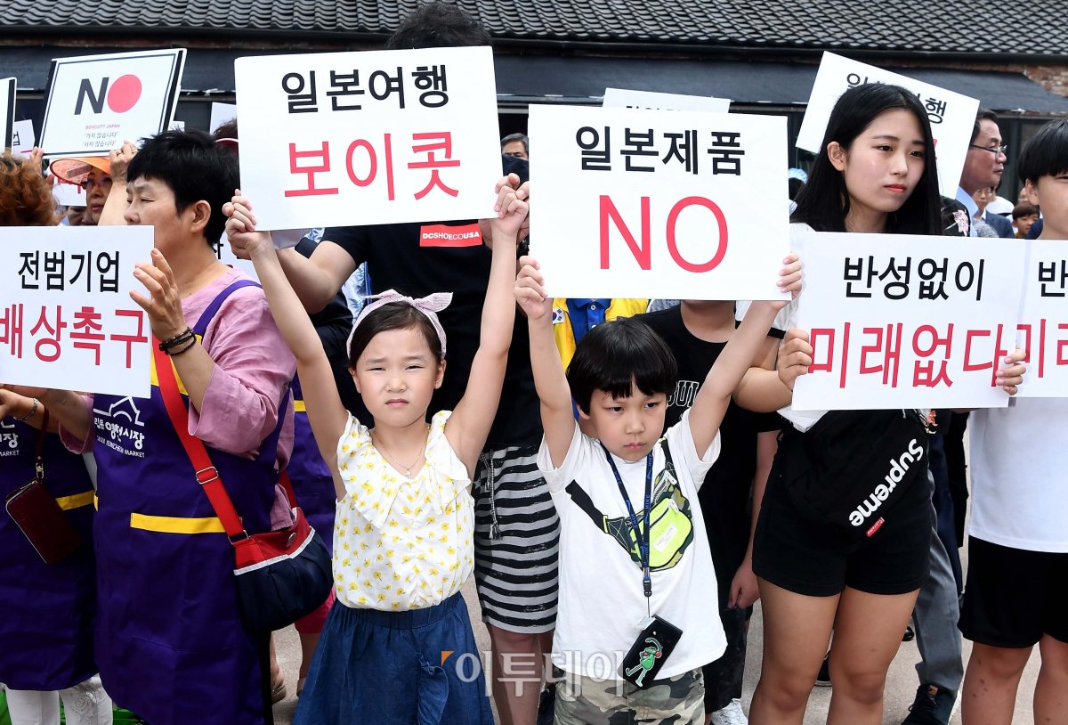 30일 서울 서대문구 통일로 서대문형무소 역사관에서 열린 ‘일본의 수출규제 조치 규탄대회’에 참석한 시민들이 일본 정부를 규탄하는 손팻말을 들고 있다. 이날 규탄대회엔 전국 52곳 지방자치단체로 구성된 ‘일본 수출규제 공동대응 지방정부 연합’의 정원오 성동구청장, 김미경 은평구청장, 김수영 양천구청장, 문석진 서대문구청장, 박용갑 대전 중구청장, 염태영 수원시장 등이 참석해 공동성명서를 발표하고 ‘일본의 수출규제 조치는 명백한 경제보복 행위’라고 지적했다. 신태현 기자 holjjak@
