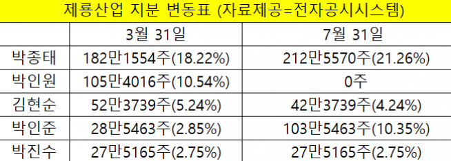 금융감독원 전자공시시스템에 따르면 제룡산업은 지난달 31일 창업주인 박인원 고문이 아들인 박종태 대표이사와 손자인 박인준 상무에게 각각 자신의 지분 30만4016주와 75만 주를 증여했다. 이로써 박 고문의 지분은 0%가 됐다. 수증을 통해 박 대표의 지분은 18.22%에서 21.26%로 상승했고, 박 상무는 2.85%에서 10.35%로 4배 가까이 늘었다.