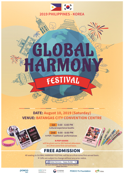 마지막으로 10일(토)에는 바탕가스 지역 주민 1000여 명을 대상으로 ‘Global Harmony festival’이 열린다. 한-필 쌍방향 문화교류축제인 글로벌 하모니 페스티벌은 한국, 필리핀 대학생 봉사단들이 준비한 K-Pop 댄스와 보컬 공연을 시작으로, 필리핀 전통 공연•전문 커버댄스팀 공연 등 다채로운 무대가 구성된다.