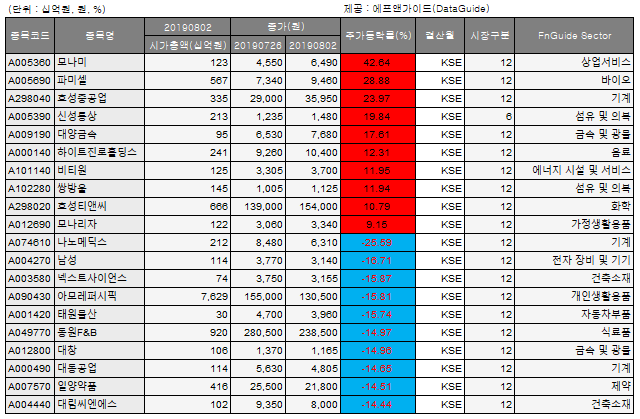 ◇모나미, 일제 불매운동 효과 ‘톡톡’ 42.64%↑=에프앤가이드에 따르면 한 주간 코스피 시장에서 가장 급등한 종목은 모나미로, 42.64% 급등했다. 일본 정부가 한국에 대한 수출 규제를 강화하면서 국내 소비자들 사이에서는 일제 불매운동이 확산되고 있다. 모나미는 일본산 필기류 판매가 줄어들 고, 국산 제품 판매가 늘어날 것이란 반사이익 기대감에 애국주로 엮여 급등하고 있다.