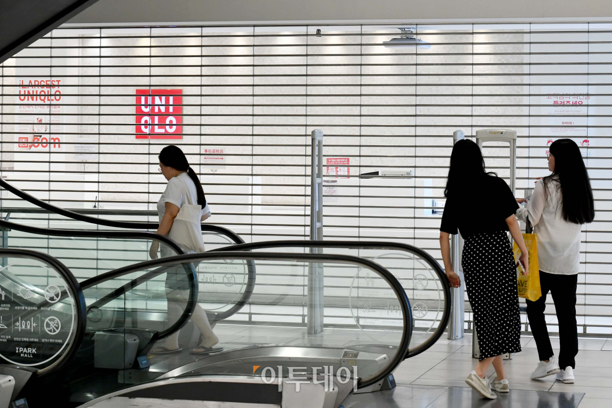 한국에 대한 일본의 수출규제 및 화이트리스트(백색국가 명단) 배제 조치로 일본 제품에 대한 불매운동이 이어지고 있는 가운데 5일 서울 용산구 한강대로 유니클로 아이파크몰점이 매장 리뉴얼로 셔터를 내린 채 영업을 중단하고 있다. 신태현 기자 holjjak@