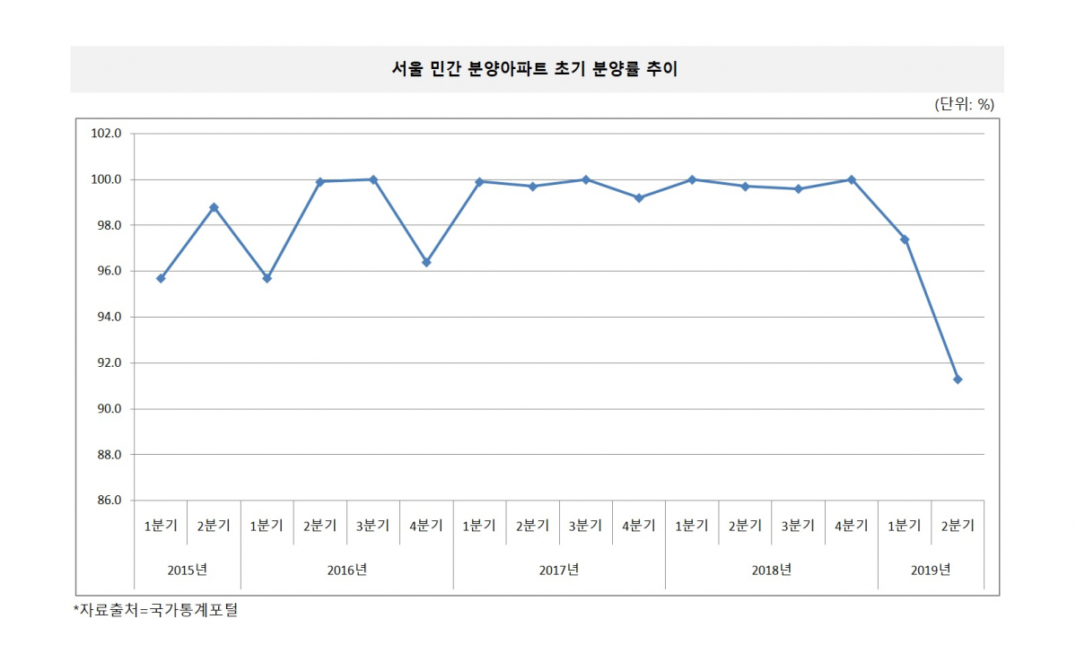 서울의 초기 분양률은 집계를 시작한 이후 줄곧 95~100% 사이에서 등락을 반복했다. 2016년 3분기, 2017년 3분기, 2018년 1·4분기에는 초기 분양률이 100%로 조사됐다. 그 외 시기에도 99.9%, 99.6% 등 100%에 가까운 수치를 기록했다.