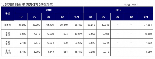 회사 관계자는 “올해 상반기는 미중 무역분쟁, 국제유가 변화 등 대외적인 변동성이 증대되고 주요 제품의 수요 회복 증가세가 둔화되며 작년 대비 수익성이 다소 감소했다”며 “하반기에는 역내 신규설비 가동에 따른 공급 증가로 인해 경쟁이 심화될 것으로 보이나, 중국 경기부양책 효과의 가시화에 따른 수요 개선과 주요 제품의 성수기 진입으로 수익성이 증가할 것”으로 예상했다.