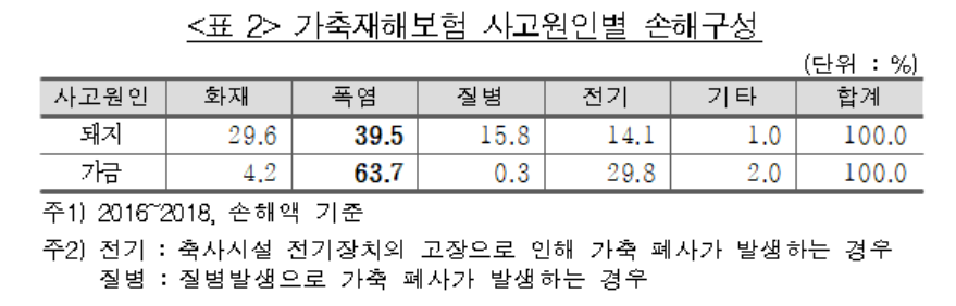 가축재해보험 사고원인을 분석한 결과, 폭염으로 인한 손해가 돼지의 경우 39.5%, 가금류의 경우 63.5%를 차지했다. 닭의 경우 대부분 케이지 사육방식으로 사육돼 폭염에 더욱 취약한 것으로 나타났다.