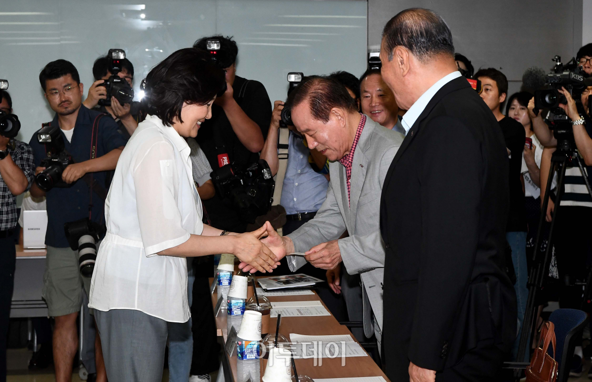 박영선(왼쪽) 중소벤처기업부 장관이 6일 서울 영등포구 여의도 중소기업중앙회에서 열린 ‘일본 수출규제에 따른 중소기업 애로청취 간담회’에 앞서 중소기업 대표들과 인사하고 있다.
