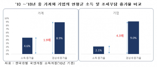 가계(비영리단체 포함)의 경우 2010~2018년 중 소득은 연평균 4.6%, 소득·부 등에 대한 경상세는 연평균 8.9% 각각 증가하여 조세 부담이 소득보다 증가속도가 2배 빨랐다.