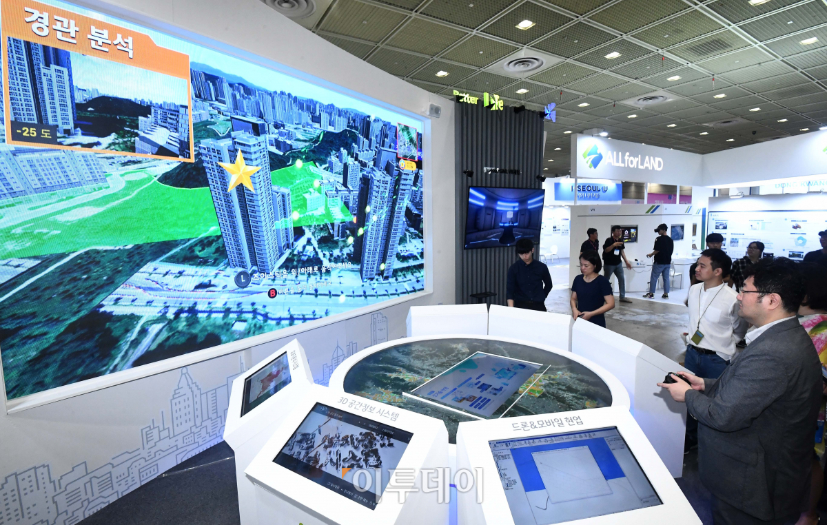 7일 서울 강남구 영동대로 코엑스에서 열린 ‘2019 스마트국토엑스포’ LH 부스에서 스마트시티 도시관리 플랫폼인 ‘디지털트윈’ 시범 서비스가 대형 스크린에 게임방식으로 구현되고 있다. ‘공간정보의 융합, 스마트한 미래를 열다’를 주제로 국토교통부가 주최한 이번 스마트국토엑스포는 차세대 혁신 산업기술과 미래 비전 공유의 장으로 23개국 정부·기관 및 85개 기업이 참여해 측량, 지적, 위성 등 공간정보 분야의 기반이 되는 기술부터 디지털트윈, IoT, AI 등 공간정보가 접목된 융·복합 기술 등을 소개했다.