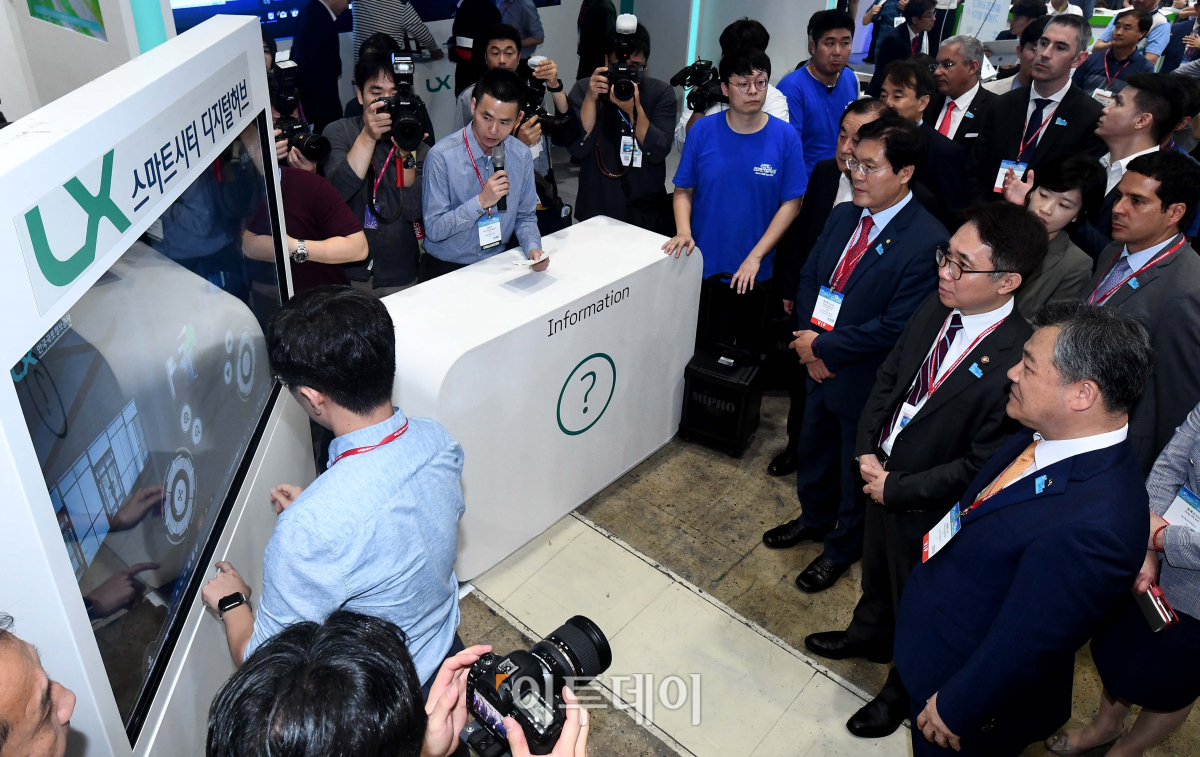 7일 서울 강남구 영동대로 코엑스에서 열린 ‘2019 스마트국토엑스포’에서 박선호 국토교통부 차관 등 내빈들이 LX의 스마트시티 디지털허브를 살펴보고 있다. ‘공간정보의 융합, 스마트한 미래를 열다’를 주제로 국토교통부가 주최한 이번 스마트국토엑스포는 차세대 혁신 산업기술과 미래 비전 공유의 장으로 23개국 정부·기관 및 85개 기업이 참여해 측량, 지적, 위성 등 공간정보 분야의 기반이 되는 기술부터 디지털트윈, IoT, AI 등 공간정보가 접목된 융·복합 기술 등을 소개했다.