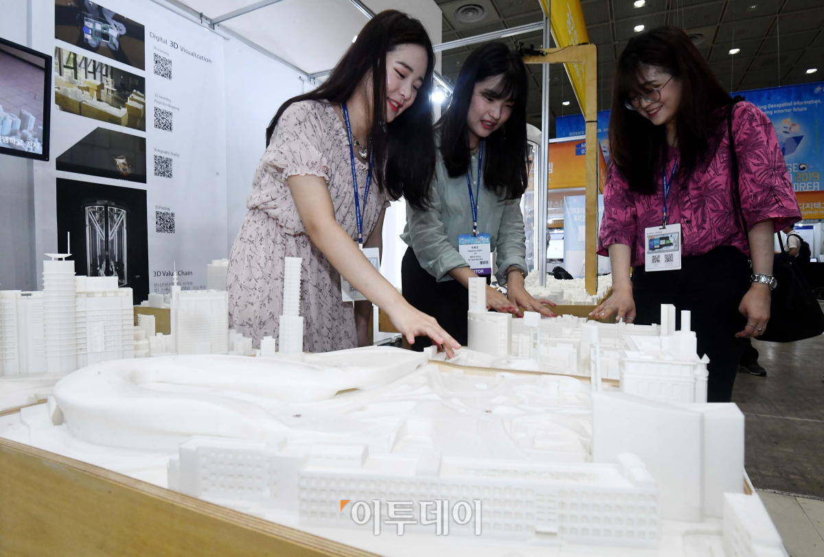 7일 서울 강남구 영동대로 코엑스에서 열린 ‘2019 스마트국토엑스포’에서 참관객들이 3D프린터로 제작한 3D 도시 모형을 살펴보고 있다. ‘공간정보의 융합, 스마트한 미래를 열다’를 주제로 국토교통부가 주최한 이번 스마트국토엑스포는 차세대 혁신 산업기술과 미래 비전 공유의 장으로 23개국 정부·기관 및 85개 기업이 참여해 측량, 지적, 위성 등 공간정보 분야의 기반이 되는 기술부터 디지털트윈, IoT, AI 등 공간정보가 접목된 융·복합 기술 등을 소개했다.