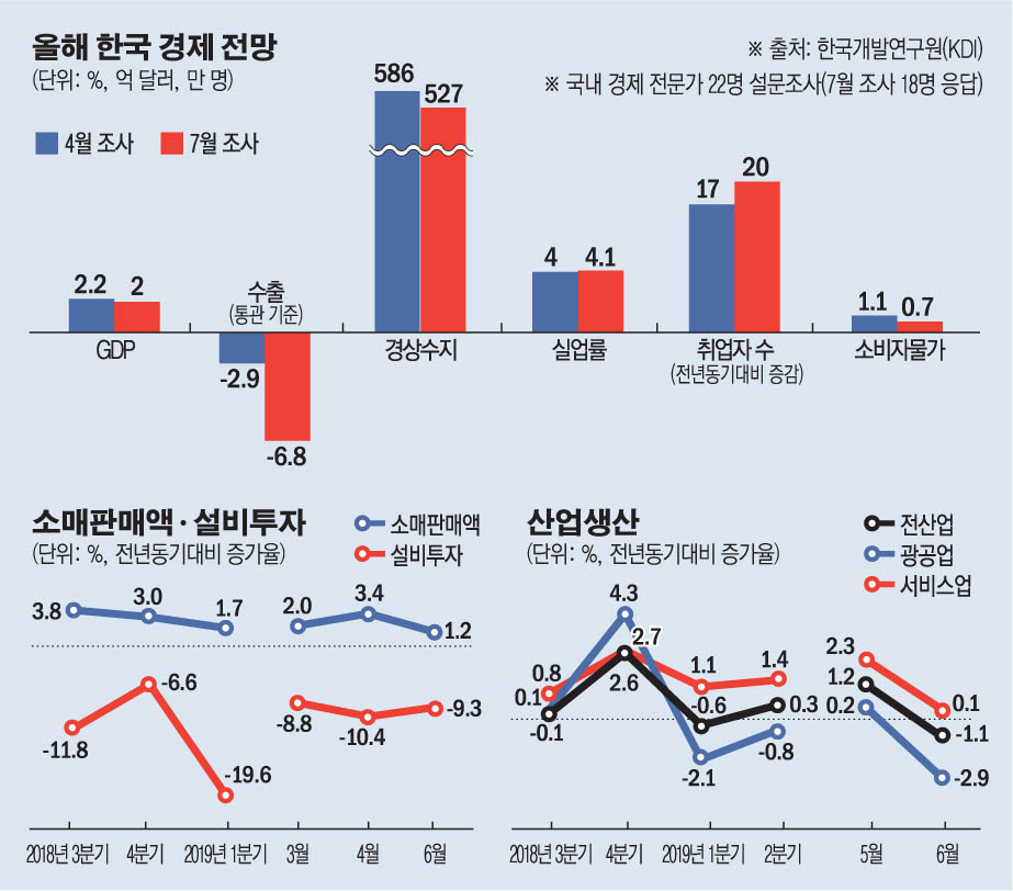 한국개발연구원(KDI)이 7일 발간한 ‘경제동향 8월호’에 실린 ‘7월 전문가 경제전망 설문조사’ 결과를 보면, 조사에 응답한 18명의 전문가는 일본 수출규제 등 대외여건 악화, 수출 부진이 하반기까지 지속돼 경제 성장률이 올해 2.0%, 내년 2.2%에 머물 것으로 내다봤다.