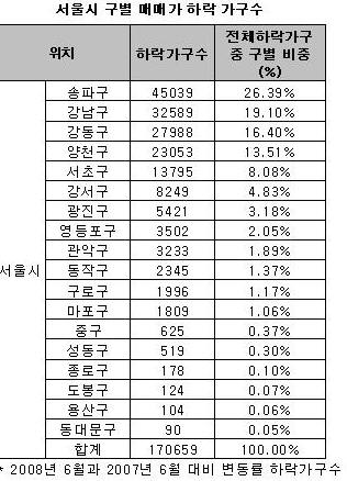 이중, 강남권인 강남, 서초, 송파, 강동, 양천구가 총 300단지 14만2464가구로 전체 하락단지 중 83%나 차지하고 있는 것으로 조사됐다.
