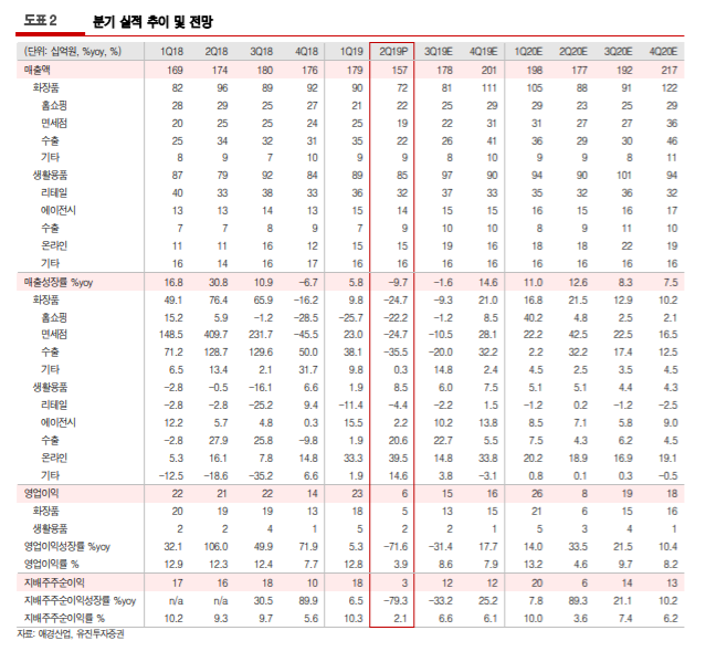 그는 “화장품 부문에서 외형성장이 부진한 가운데 고정비 부담이 증가하고, 마케팅비용 투자가 늘어나면서 수익성도 크게 훼손됐다”고 덧붙였다.