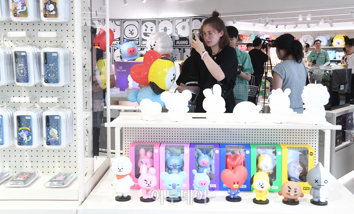 네이버의 글로벌 캐릭터 브랜드 라인프렌즈가 강남역에 플래그십스토어를 오픈한 8일 서울 강남구 강남대로 라인프렌즈 플래그십스토어 강남점에서 외국인들이 방탄소년단과의 콜라보레이션 캐릭터 상품 ‘BT21’을 살펴보고 있다.