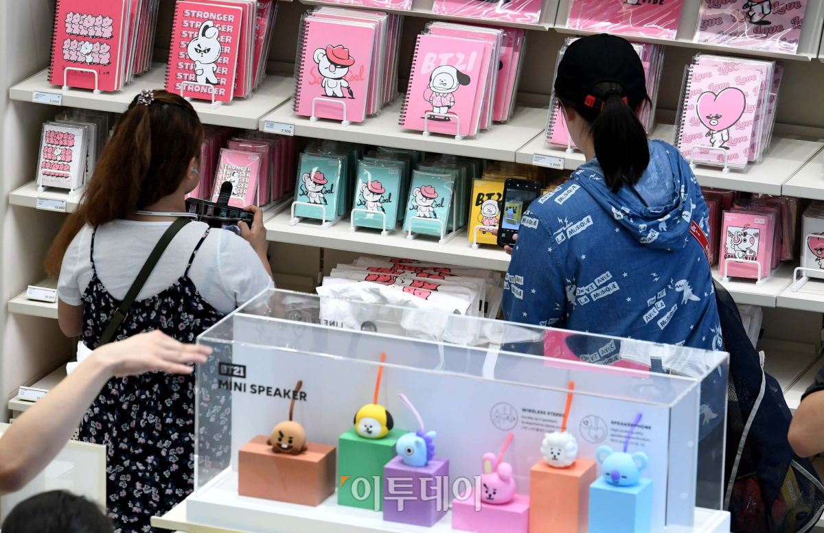 네이버의 글로벌 캐릭터 브랜드 라인프렌즈가 강남역에 플래그십스토어를 오픈한 8일 서울 강남구 강남대로 라인프렌즈 플래그십스토어 강남점에서 외국인들이 방탄소년단과의 콜라보레이션 캐릭터 상품 ‘BT21’을 살펴보고 있다.