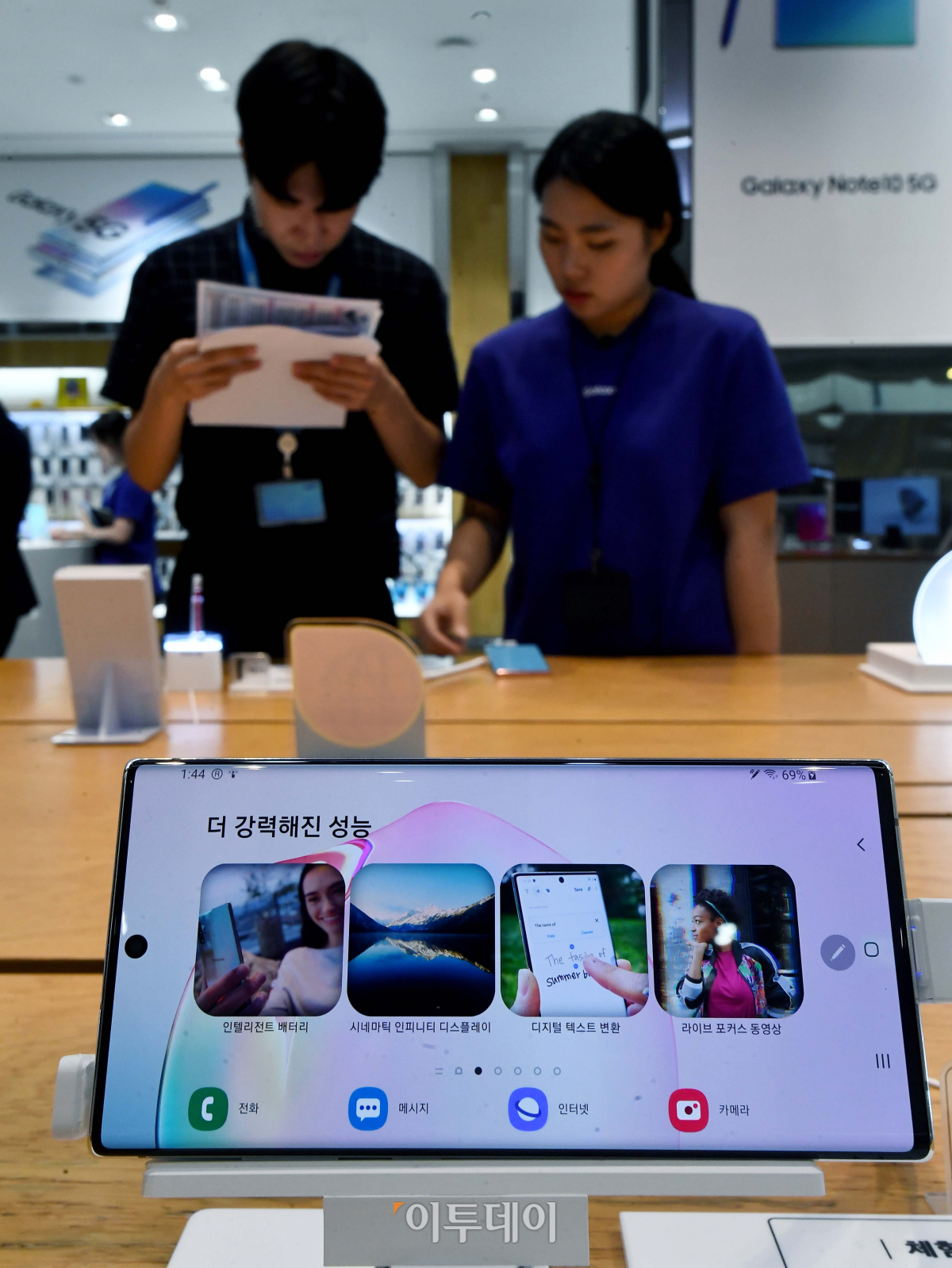 삼성전자의 하반기 전략 스마트폰 ‘갤럭시노트10’이 공개된 8일 서울 삼성전자 서초사옥 삼성 딜라이트 샵에 갤럭시노트10이 전시돼 있다.