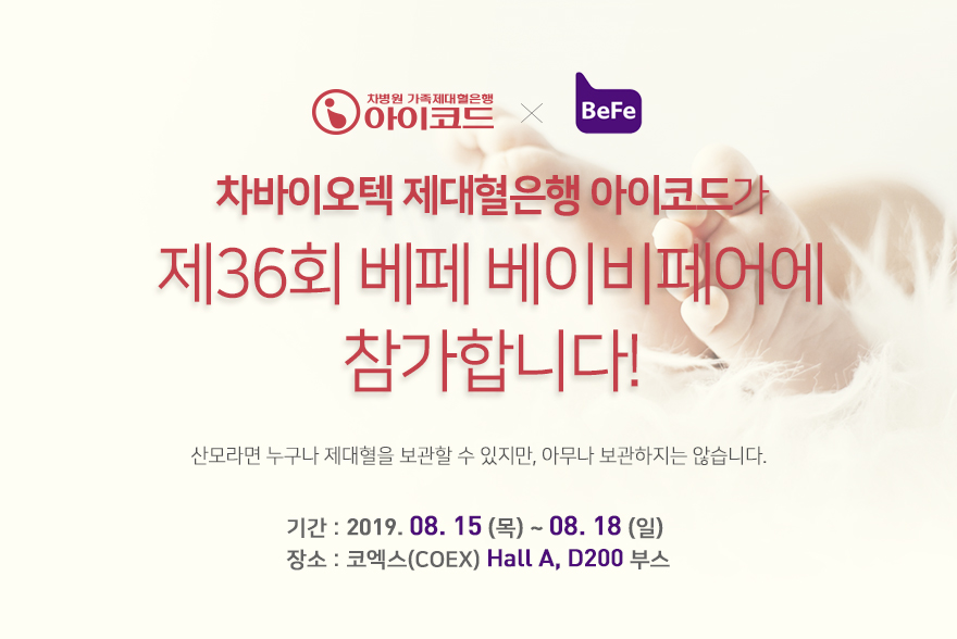 차바이오텍은 제대혈은행 ‘아이코드’가 제36회 베페 베이비페어에 참가한다고 9일 밝혔다.