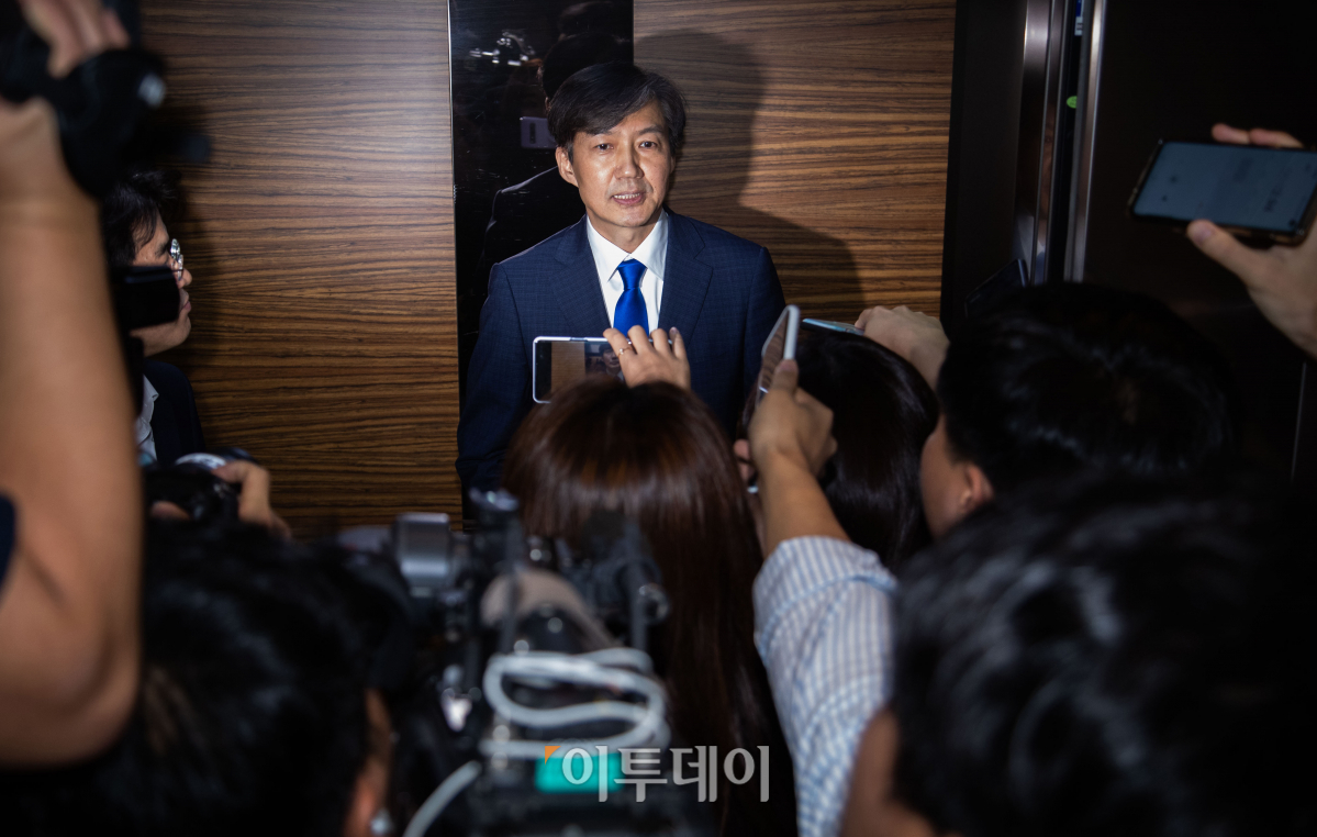 조국 법무부 장관 후보자가 9일 인사청문회 준비 사무실이 마련된 서울 종로구 적선현대빌딩 로비에서 소감을 밝힌 뒤 엘리베이터에 탑승하고 있다.