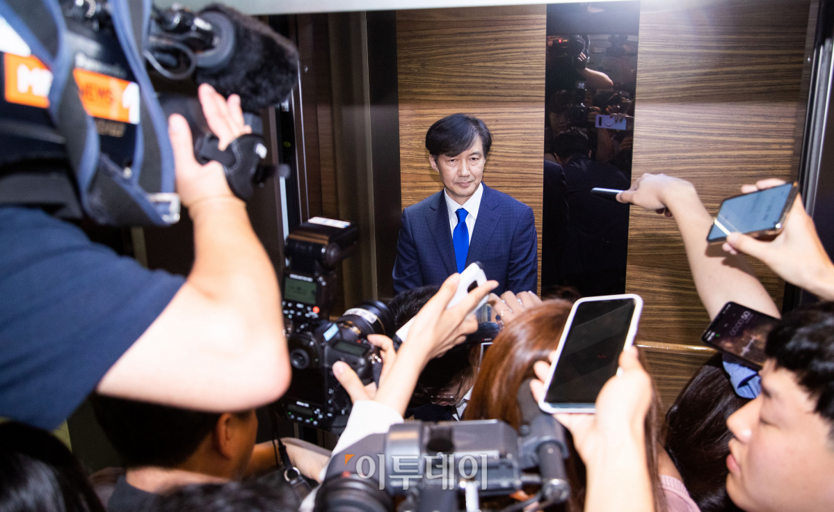 조국 법무부 장관 후보자가 9일 인사청문회 준비 사무실이 마련된 서울 종로구 적선현대빌딩 로비에서 소감을 밝힌 뒤 엘리베이터에 탑승하고 있다.
