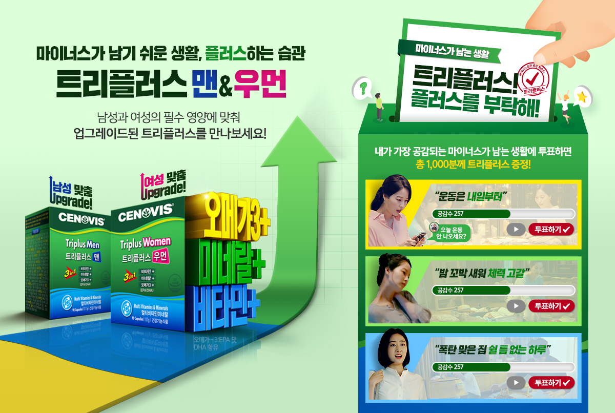 9월 8일까지 진행되는 이번 캠페인은 바쁜 현대인들의 마이너스가 남기 쉬운 요즘 생활을 플러스로 채워줄 신제품 ‘트리플러스 맨&우먼’을 소비자들이 체험해볼 수 있도록 기획됐다. 캠페인 페이지에서 약 4주 동안 전개되며, 마이너스 생활 순간에 대해 다룬 영상을 본 후 가장 공감 가는 순간에 투표하면 추첨을 통해 1천명에게 최신의 영양을 담은 프리미엄 멀티비타민 ‘트리플러스 맨&우먼’ 무료 체험(정품 200개, 10캡슐 샘플 800개)의 기회가 부여된다.
