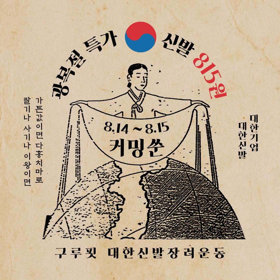 신발 종합쇼핑몰 '구루핏'은 광복절을 맞이해 14~15일 이틀 간 '대한민국 신발 815원' 캠페인을 진행한다.