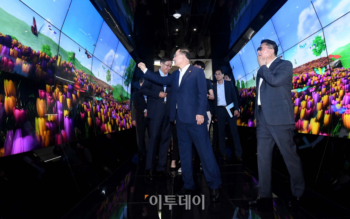 홍남기 경제부총리 겸 기획재정부 장관이 12일 디스플레이 업종 현장방문차 경기 파주시 월롱면 LG디스플레이 파주공장을 찾아 전시장을 둘러보고 있다. 신태현 기자 holjjak@