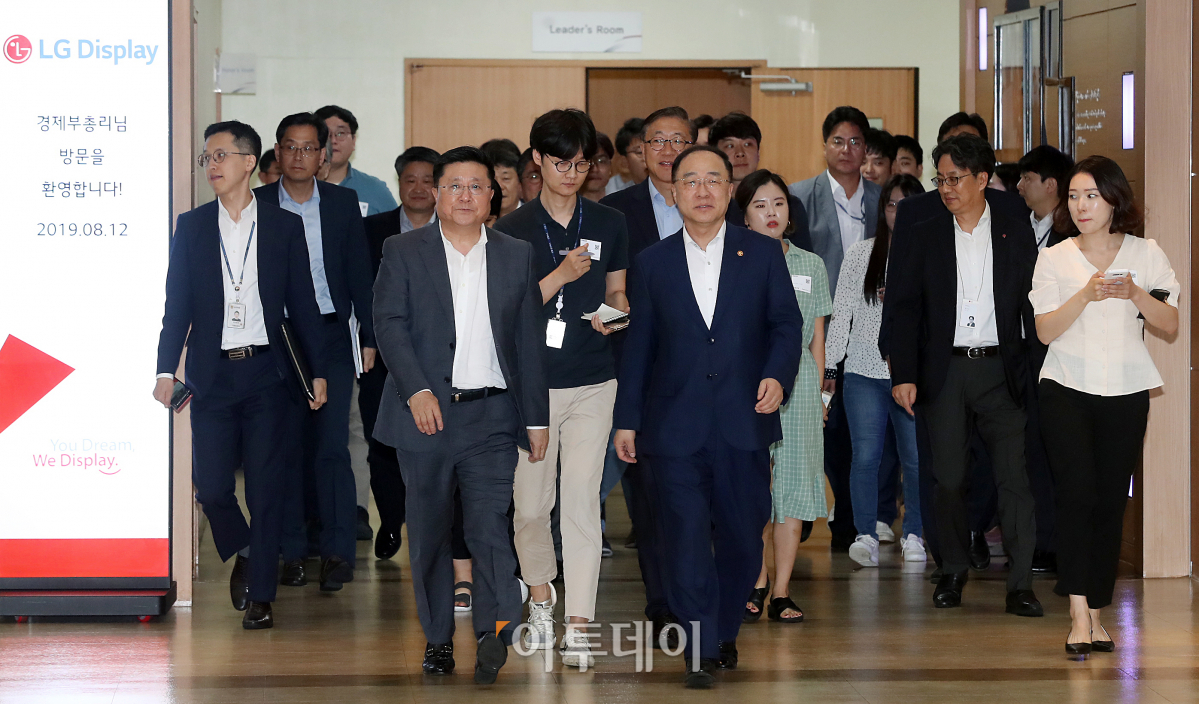 홍남기 경제부총리 겸 기획재정부 장관이 12일 디스플레이 업종 현장방문차 경기 파주시 월롱면 LG디스플레이 파주공장을 찾아 한상범 LG디스플레이 부회장과 전시장으로 향하고 있다.