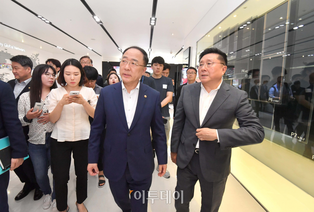 홍남기 경제부총리 겸 기획재정부 장관이 12일 디스플레이 업종 현장방문차 경기 파주시 월롱면 LG디스플레이 파주공장을 찾아 한상범 LG디스플레이 부회장의 안내를 받으며 전시장을 둘러보고 있다.