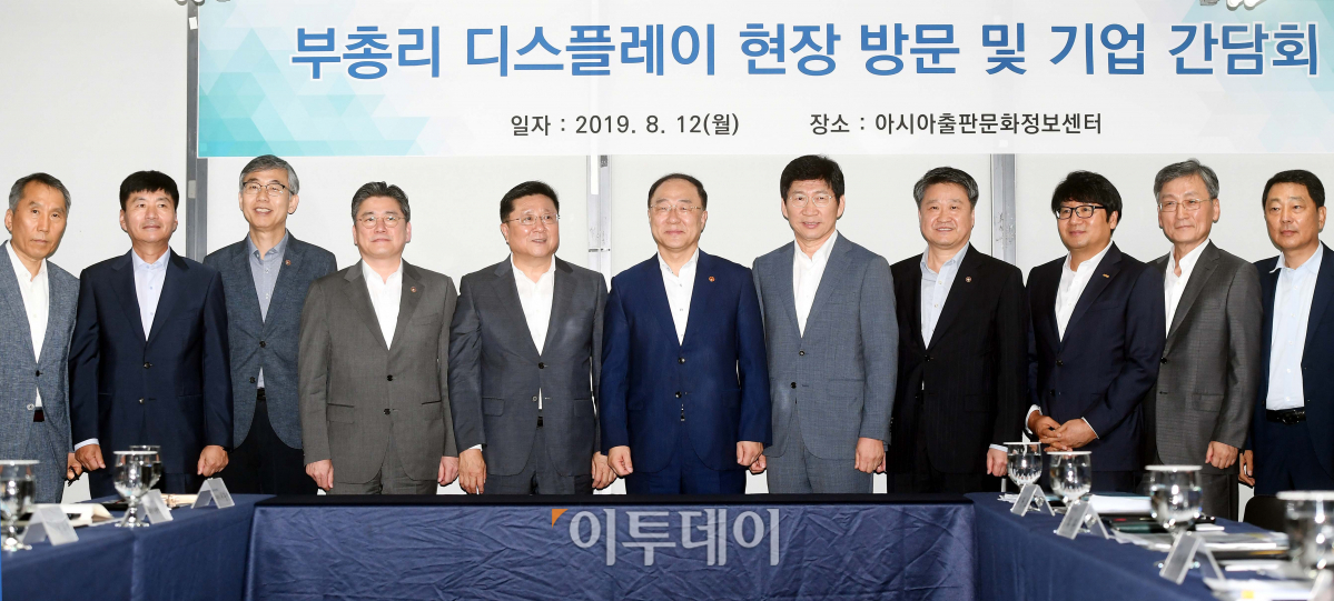홍남기 경제부총리 겸 기획재정부 장관과 이동훈 한국디스플레이산업협회장 등이 12일 오후 경기 파주시 파주출판단지 아시아출판문화정보센터에서 열린 디스플레이 현장 방문 및 기업 간담회에 앞서 기념촬영을 하고 있다.