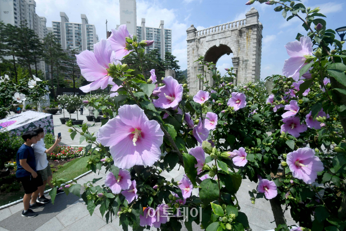 광복절을 이틀 앞둔 13일 서울 서대문구 통일로 서대문 독립공원 일대에서 열린 ‘서울무궁화축제’에서 학생들이 무궁화를 감상하고 있다. 오는 15일까지 진행되는 서울무궁화축제는 서울시가 광복절을 맞아 ‘역사의 외침, 꽃의 함성’을 주제로 나라꽃 무궁화와 대한민국 임시정부 100주년을 기념하기 위해 마련했다.