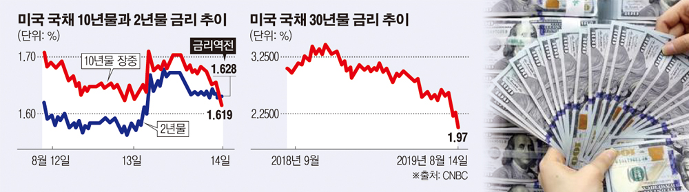 10년물과 2년물 금리 역전과 30년물 금리 사상 최저치 기록 등 이날 벌어진 두 가지 역사적인 움직임은 투자자들이 미국과 세계 경기둔화에 대비하고 있다는 것을 뜻한다고 CNBC는 풀이했다. 채권 가격과 금리는 반대로 움직인다.