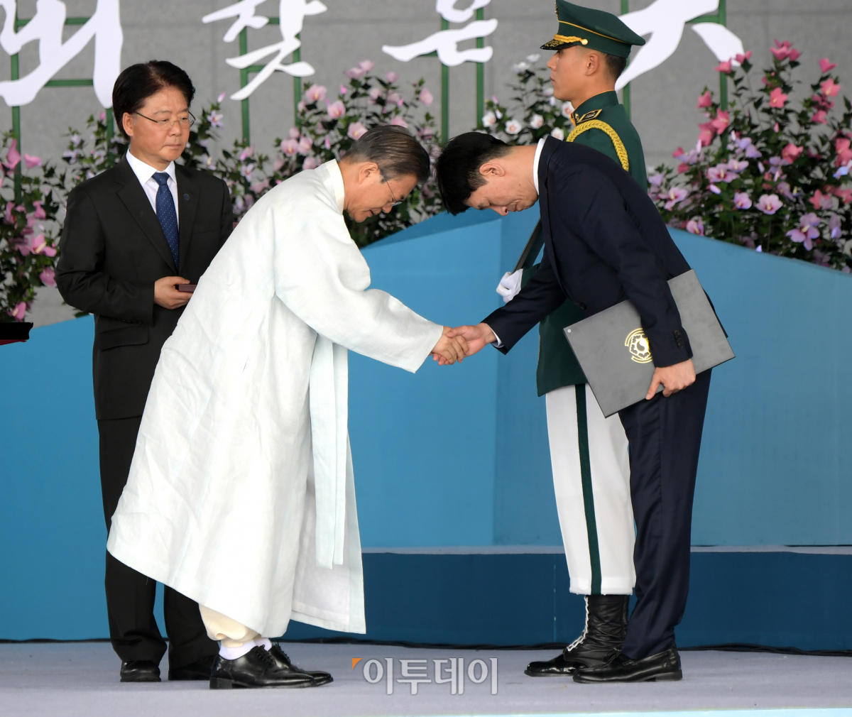 문재인 대통령이 15일 오전 충남 천안 독립기념관 겨레의 집에서 열린 제74주년 광복절 경축식에서 포상 독립유공자 고 김한정의 증손 김현탁 씨에게 건국훈장 애국장을 서훈하고 있다. 사진공동취재단