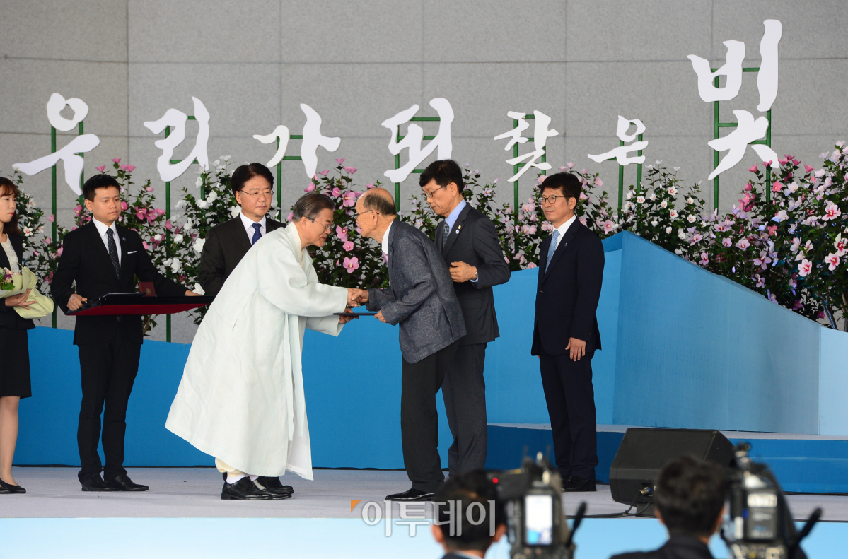 문재인 대통령이 15일 오전 충남 천안 독립기념관 겨레의 집에서 열린 제74주년 광복절 경축식에서 독립유공자에게 포상을 하고 있다. 사진공동취재단