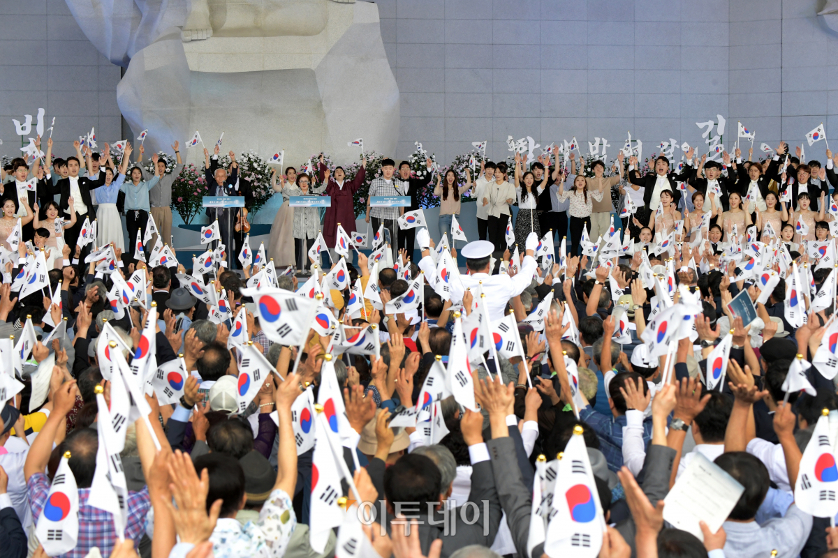 15일 오전 충남 천안 독립기념관 겨레의 집에서 열린 제74주년 광복절 경축식에서 참석자들이 만세삼창을 하고 있다. 사진공동취재단