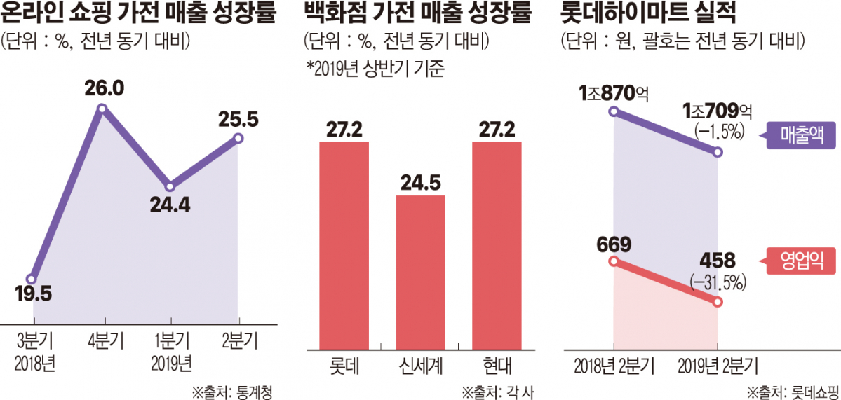 여기에다 오프라인 매출마저 백화점에 밀리고 있다. 올해 상반기 롯데백화점의 가전제품 매출 증가율은 27.2%, 7월에도 10.1%를 기록했다. 현대백화점과 신세계백화점 역시 상반기 가전 매출 신장률이 각각 27.2%, 24.5%로 가파른 성장세를 보였다.