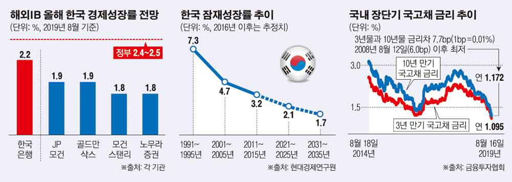 국고채 장단기 금리와 각종 경제지표도 침체 위험을 경고한다. 서울 채권시장에서 10년 만기 국고채 금리는 16일 기준 사상 최저인 1.172%로 떨어졌다. 3년 만기 국고채 금리 역시 사상 최저인 1.095%였다. 장단기 금리 격차는 7.7bp로 2008년 8월 12일 6.0bp를 기록한 이래 가장 작았다.