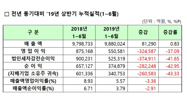 19일 한국거래소와 한국상장사회사협의회가 12월 결산 코스피 상장사 578개사(금융사 등 제외) 연결재무제표를 분석한 결과 이들 기업의 상반기 매출은 988조 원으로 전년동기대비 0.83% 증가했다. 그러나 영업이익은 55조 원으로 37.09% 줄었으며 순이익도 37조 원으로 42.95% 감소했다.