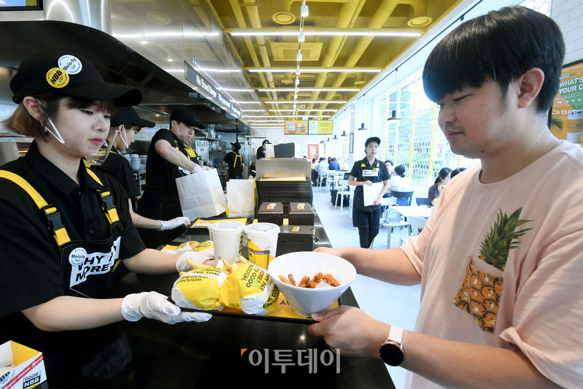 신세계푸드가 햄버거 브랜드 ‘노브랜드 버거(No Brand Burger)’를 홍익대 인근에 첫 개점한 19일 서울 마포구 홍익로 노브랜드 버거 홍대점에서 시민들이 햄버거를 즐기고 있다. ‘노브랜드 버거’는 ‘가성비 버거’란 콘셉트를 소비자에게 쉽게 전달하기 위해 신세계푸드가 운영해온 ‘버거플랜트(Burger Plant)’를 리뉴얼한 브랜드로 햄버거 11종 등 푸짐하고 독자적인 감칠맛의 서양식 패스트 캐쥬얼 푸드를 합리적인 가격으로 판매한다. 시중에서 판매 중인 햄버거에 비해 약 20% 두꺼운 패티를 사용해 풍부한 식감을 느낄 수 있다.