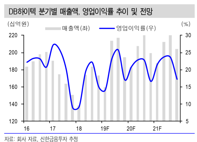 신한금융투자는 20일 DB하이텍에 대해 3분기 사상 최대 실적이 전망된다며 목표가를 기존 1만8000원에서 2만 원으로 상향하고 투자의견 ‘매수’를 유지했다.