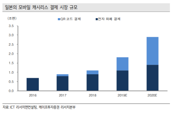 이경일 연구원은 “2020년 일본의 모바일 캐시리스 결제 시장규모는 전년 동기 대비 61% 증가한 수준으로 고성장할 전망”이라며 “라인의 높은 접근성을 바탕으로 라인 페이의 시장점유율이 더욱 확대될 것”이라고 분석했다.