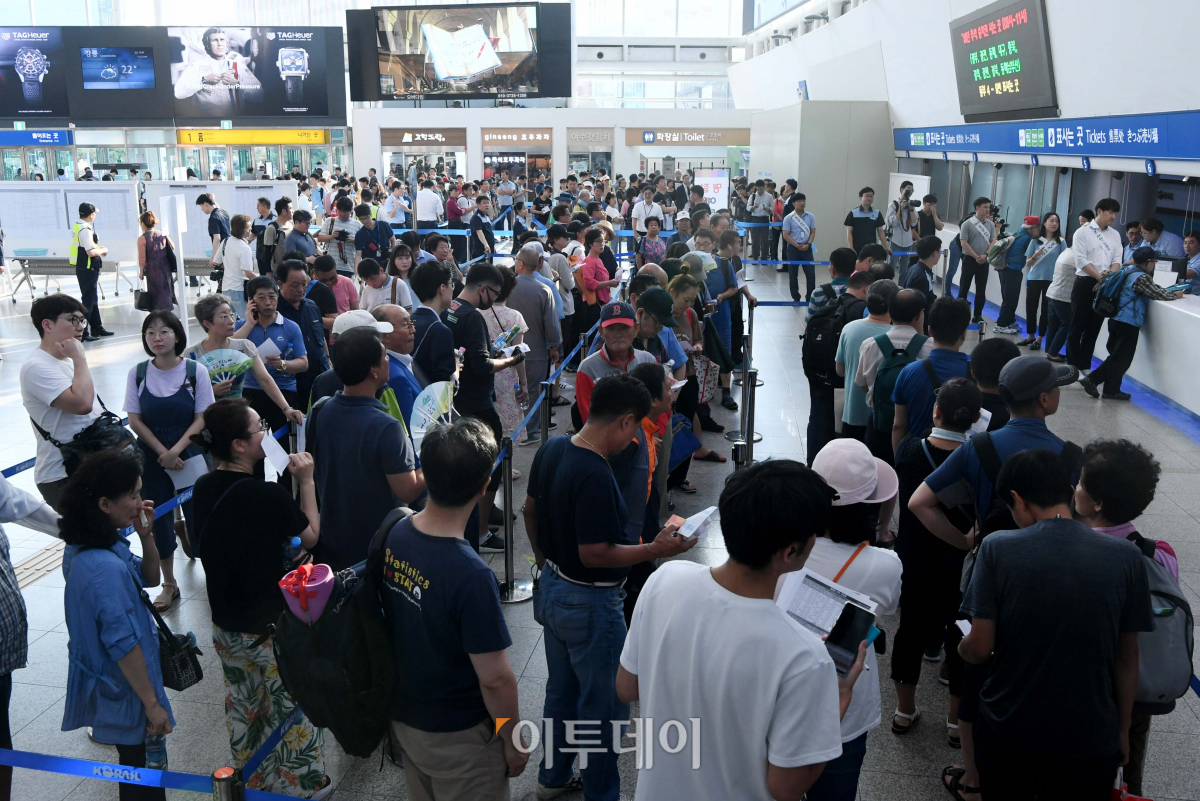 추석 열차 승차권 예매가 시작된 20일 오전 서울 용산구 한강대로 서울역에서 시민들이 승차권을 구매하기 위해 기다리고 있다. 코레일은 올해 추석 열차승차권 예매를 이날부터 이틀간 홈페이지와 지정된 역 창구 등에서 실시한다. 20일은 경부선, 21일에는 호남선 승차권 예매가 가능하다.