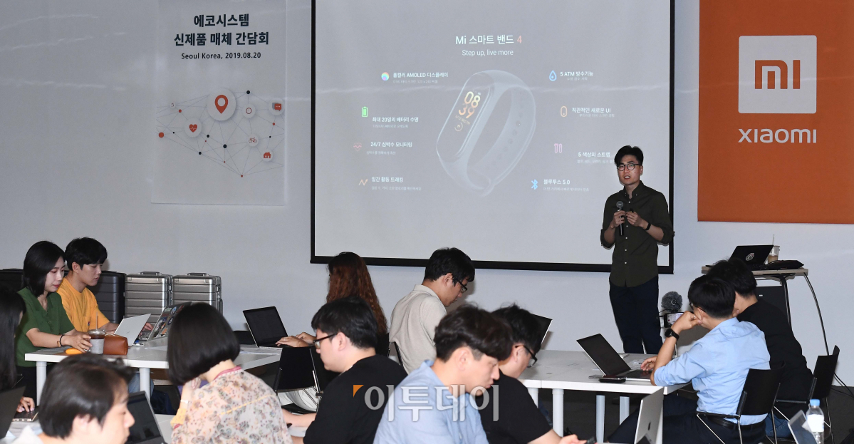스티븐 왕(Steven Wang) 샤오미 동아시아 총괄 매니저가 20일 서울 중구 을지로 동대문디자인플라자(DDP)에서 미밴드4(Mi 스마트 밴드4) 등 샤오미의 에코시스템 신제품 간담회를 갖고 있다.