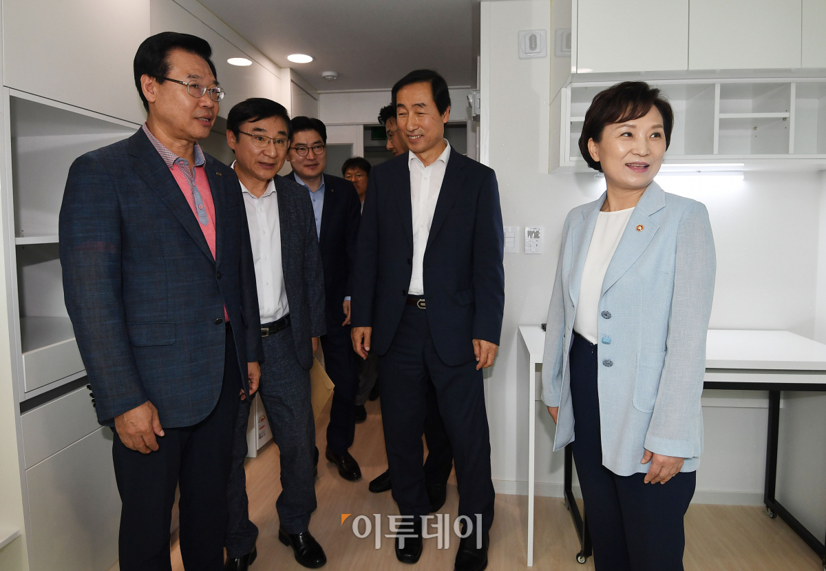 김현미 국토교통부 장관과 서울시 구청장들이 21일 서울 서대문구 대현동 기숙사형청년주택을 찾아 주택 내부를 둘러보고 있다.