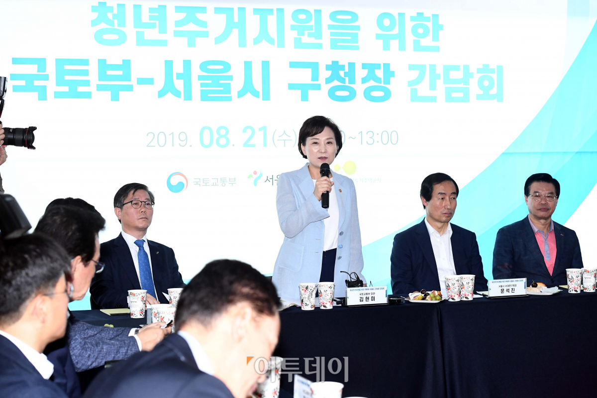 김현미 국토교통부 장관이 21일 서울 서대문구 대현동 기숙사형청년주택에서 열린 ‘청년주거지원을 위한 국토부-서울시 구청장 간담회’에서 인사말을 하고 있다.